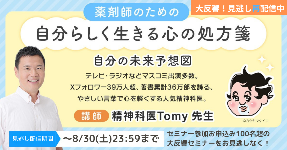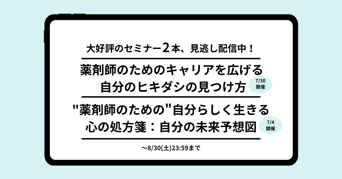 このたび、大好評をいただいた2つのオンラインセミナーの【見逃し配信】がスタートしました。薬剤師としての「キャリア」と「心の在り方」に向き合う、特別……